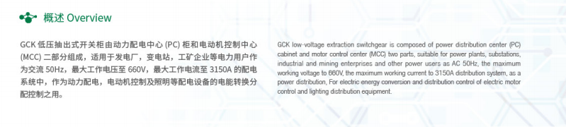 El tablero seccionable de bajo voltaje GCK es una solución modular de distribución de energía compuesta por dos partes principales: el gabinete del centro de distribución de energía (PC) y el centro de control de motores (MCC). Este tablero eléctrico está diseñado para usuarios de energía como plantas de energía, subestaciones, empresas industriales y mineras, y funciona como una plataforma confiable para la conversión, distribución y control de energía en sistemas de energía de CA de 50 Hz. Es la mejor opción para aplicaciones de aparamenta de bajo voltaje, con un voltaje operativo máximo de hasta 660 V y una corriente operativa máxima de hasta 3150 A.